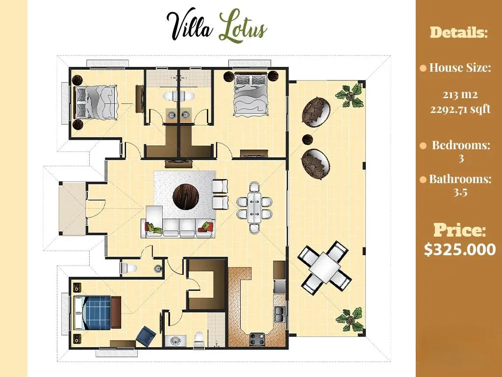 Large luxury Villa with 3 master suites each with their own private bathroom as well as half bathroom in the living room.