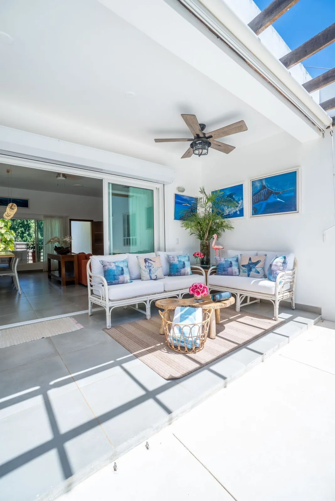 There is a covered terrace in the backyard. Here you can relax on the sofa or enjoy the pool. It has a solar water heater for the pool.