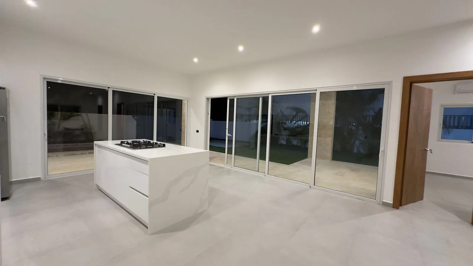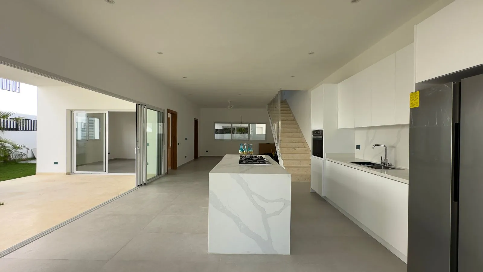 An open-plan kitchen-dining area with a central island, equipped with an electric oven, stove, and a Samsung double-door refrigerator.
