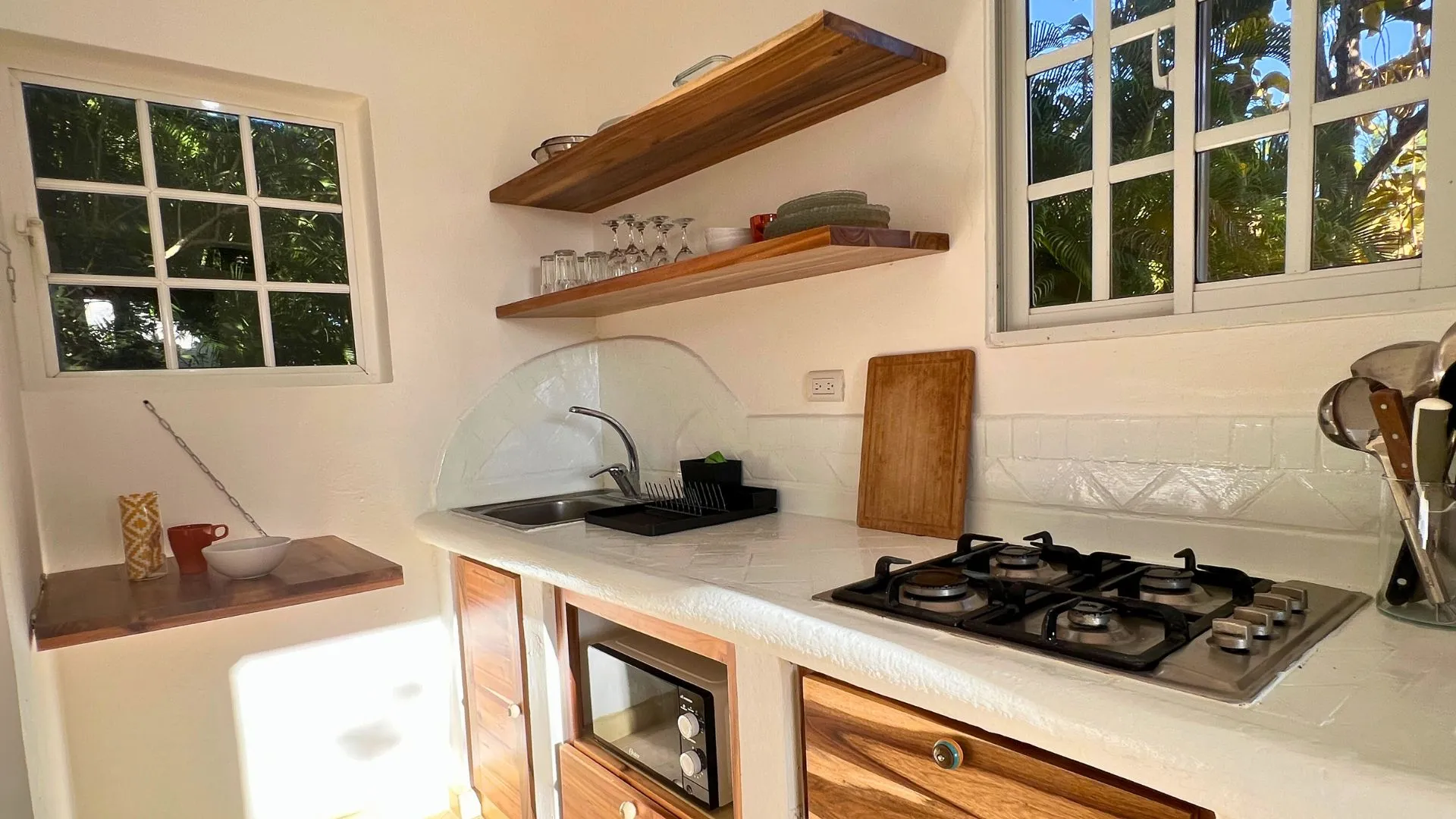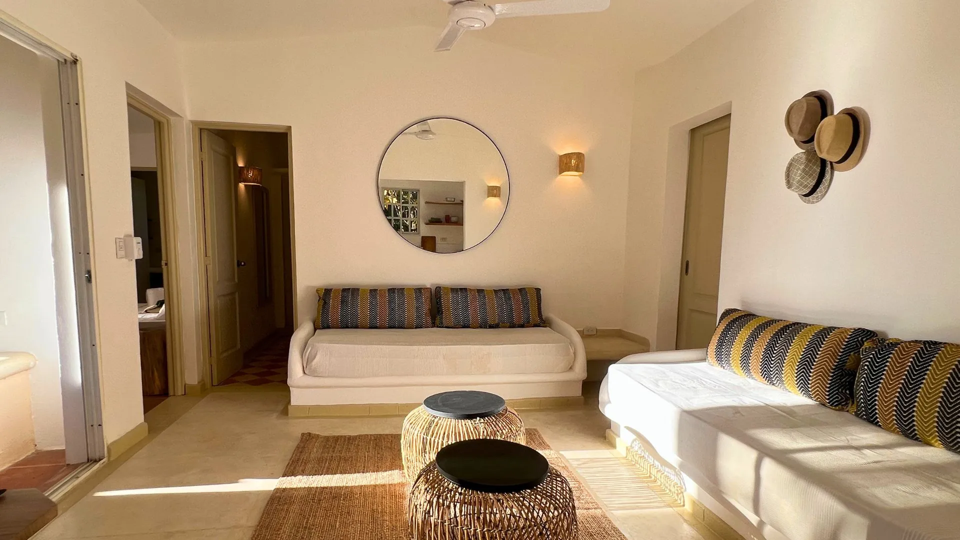 This stylishly designed 2-bedroom condo, crafted by a talented local designer, sits at the highest point of the community, offering both privacy and a serene atmosphere among lush palm trees.