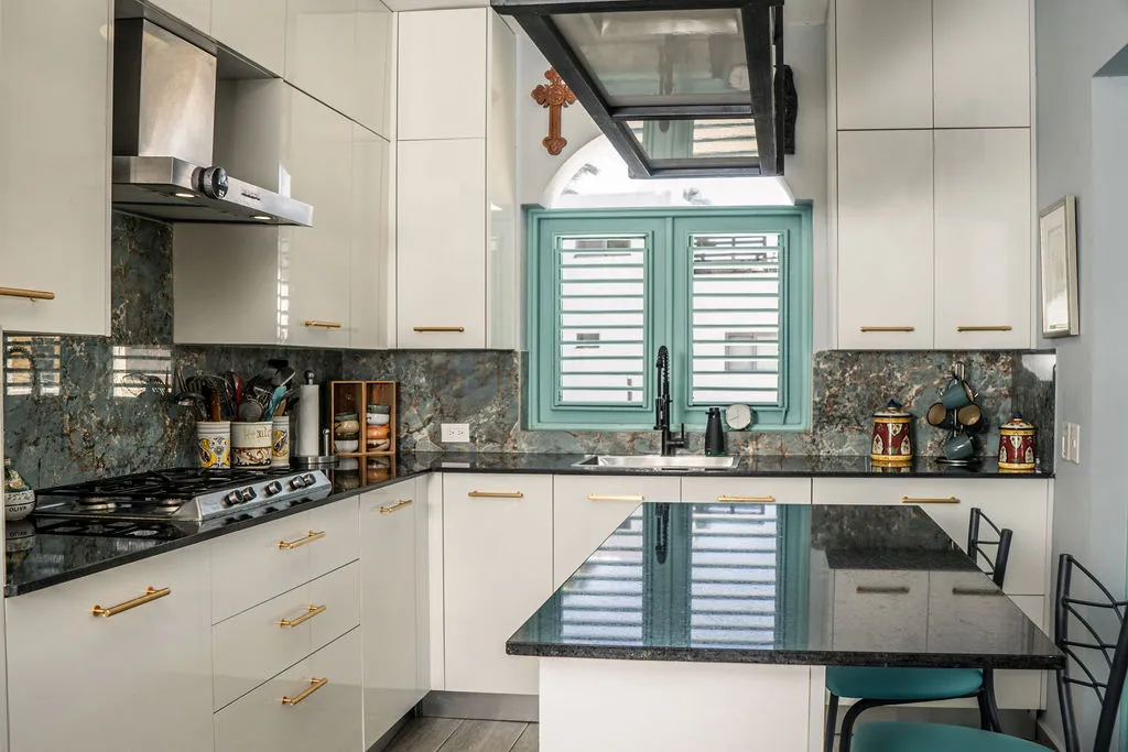 The condo was full renovated in 2022. New tasteful gray ceramic floors throughout. Fabulous gourmet kitchen renovation by Solucentro. European cabinets. Gas range and oven. Granite countertops. Work island. Open overhead cabinets for dishes and glassware.