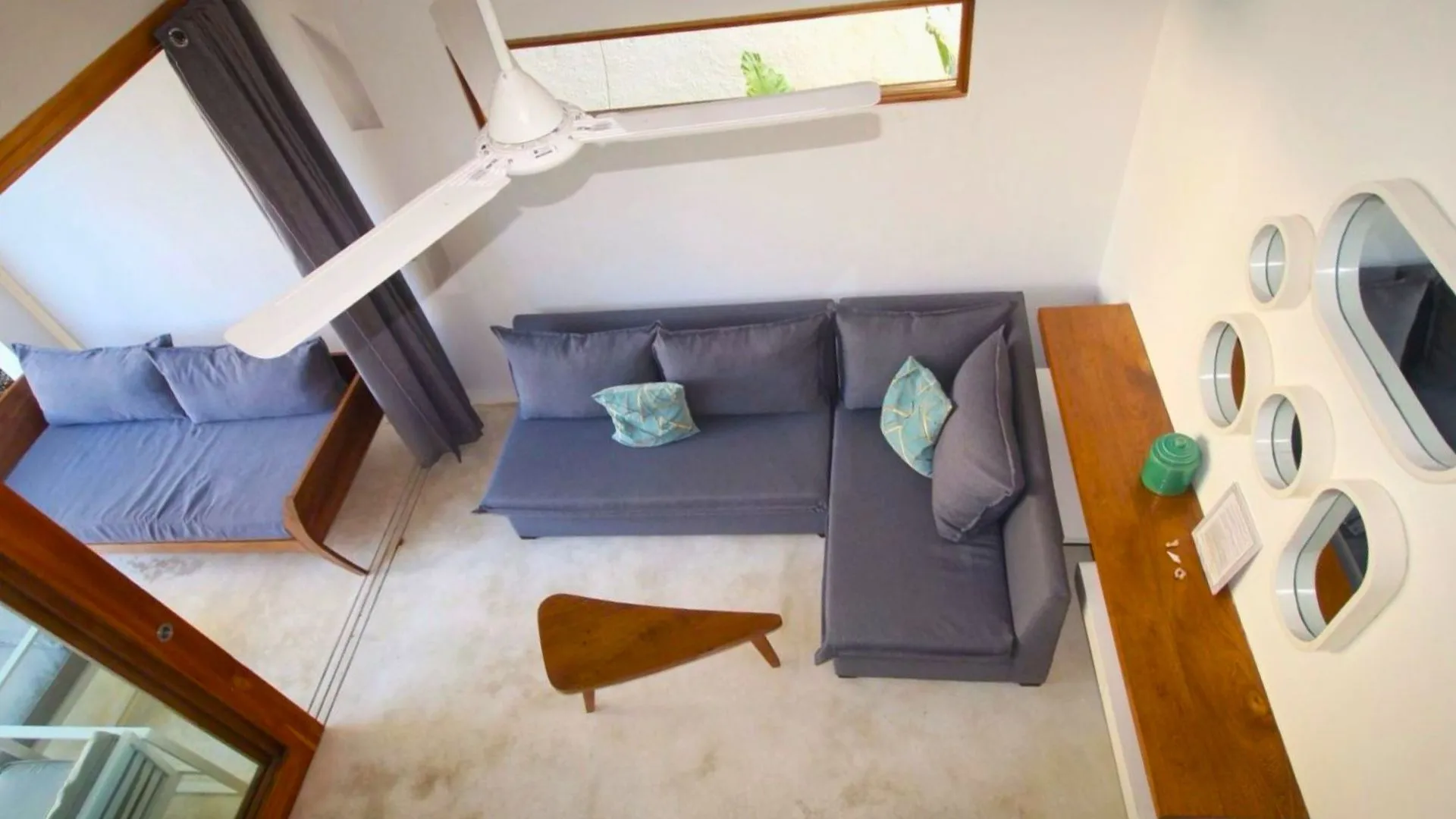 Spread across two levels, the villa features three bedrooms and two bathrooms, with the primary suite occupying the upper floor and offering a private balcony and en-suite bath.