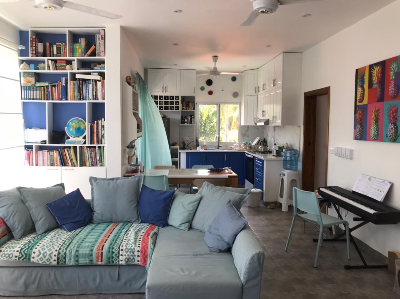 The villa features a spacious living room with high ceilings, a bright kitchen with breakfast bar, and a covered terrace that opens directly to the tropical garden and private pool. The outdoor area is designed for enjoyment, offering a gazebo, BBQ space, and outdoor shower—the perfect setting for hosting family and friends.